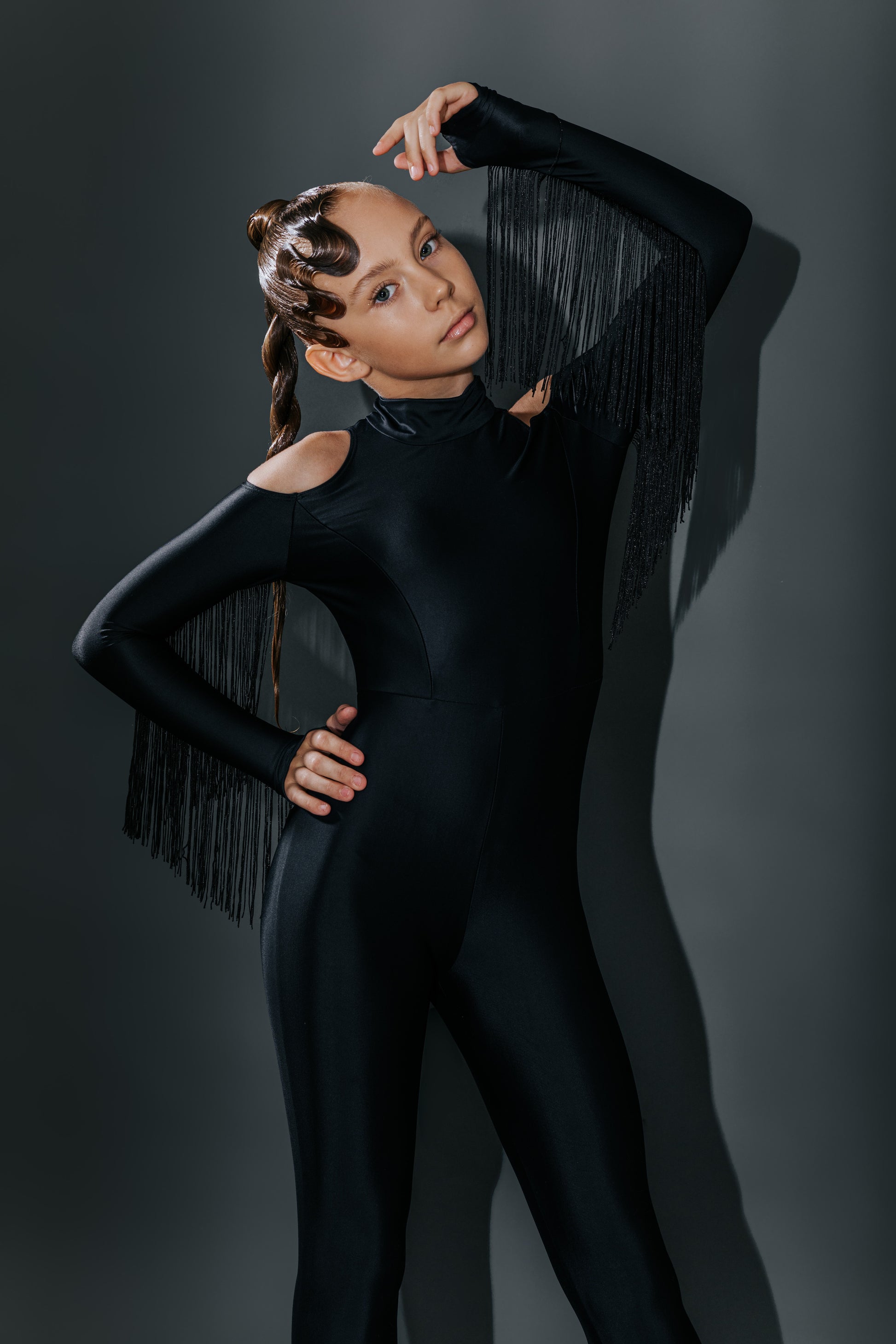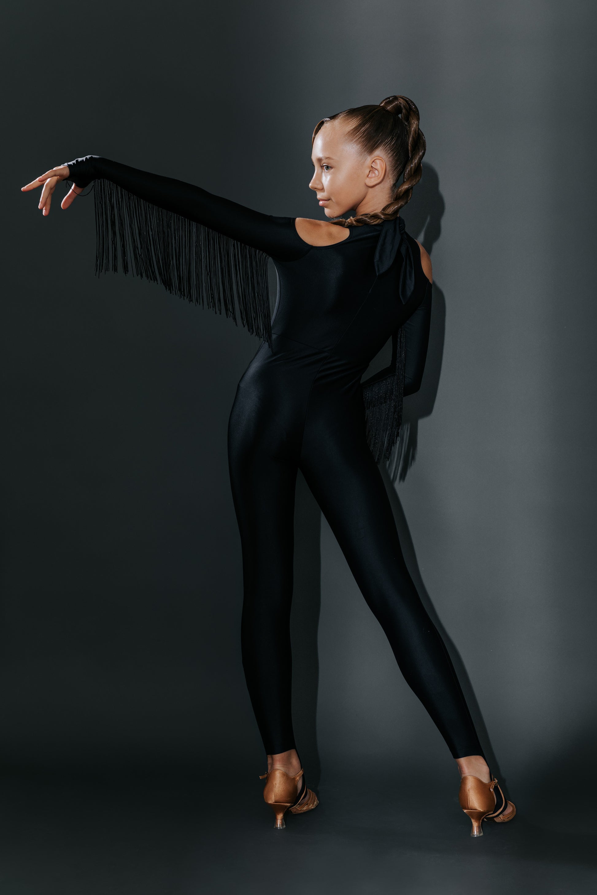 An exquisite black jumpsuit stands out with its shoulder cutouts and beautifully adorned sleeves. It boasts long, elegant sleeves, a discreet back zipper, and a stylish necktie.